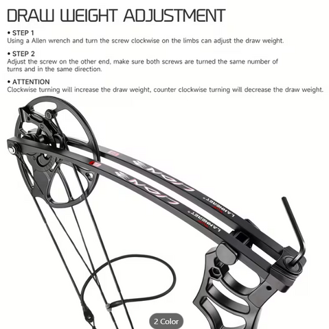 Draw weight: Adjust by turning the limb bolts. Clockwise increases draw weight; counterclockwise reduces it.